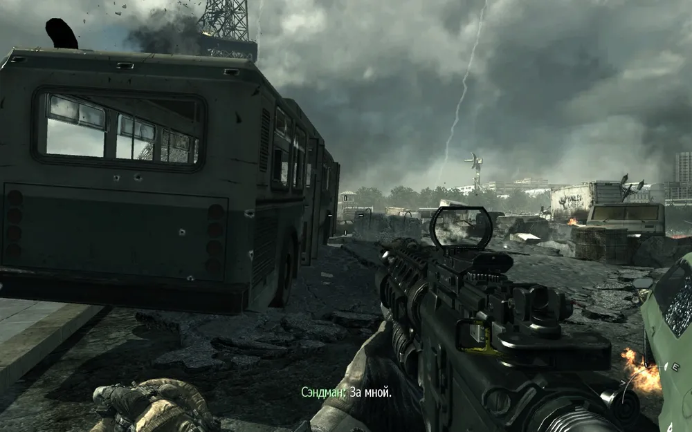 - 4. За танками следуйте по левой стороне улицы. Зайдите туда, откуда выбегут враги, в углу у лифтов будет компьютер.