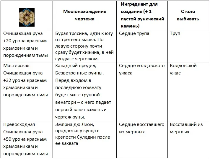 * Эмприз дю Лион, карьер в Сарнии. Необходимо пройти его целиком и выйти к длинному тоннелю – конец находится чуть ли не под самой крепостью Суледин. Жаровня будет в самом конце в тупике. Зажгите огонь и вернитесь назад – руна будет слева на выступе (слушайте звук – на стене руна не отображается).