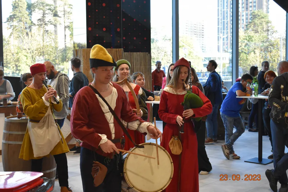 Там же можно было отведать похлёбки, сваренной по старинному рецепту и технологии, попробовать мяса от целиком зажаренной туши. Но как развести костёр под крышей зала?