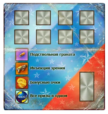 Чтобы выиграть приз, вам нужно стереть 2 поля и найти 2 одинаковые картинки: улучшенная подствольная граната, инъекция зрения, 10 бонусных очков или все три приза сразу. Также вы можете просто сыграть на нижнем поле и гарантированно получить шампанское или пару конфет.