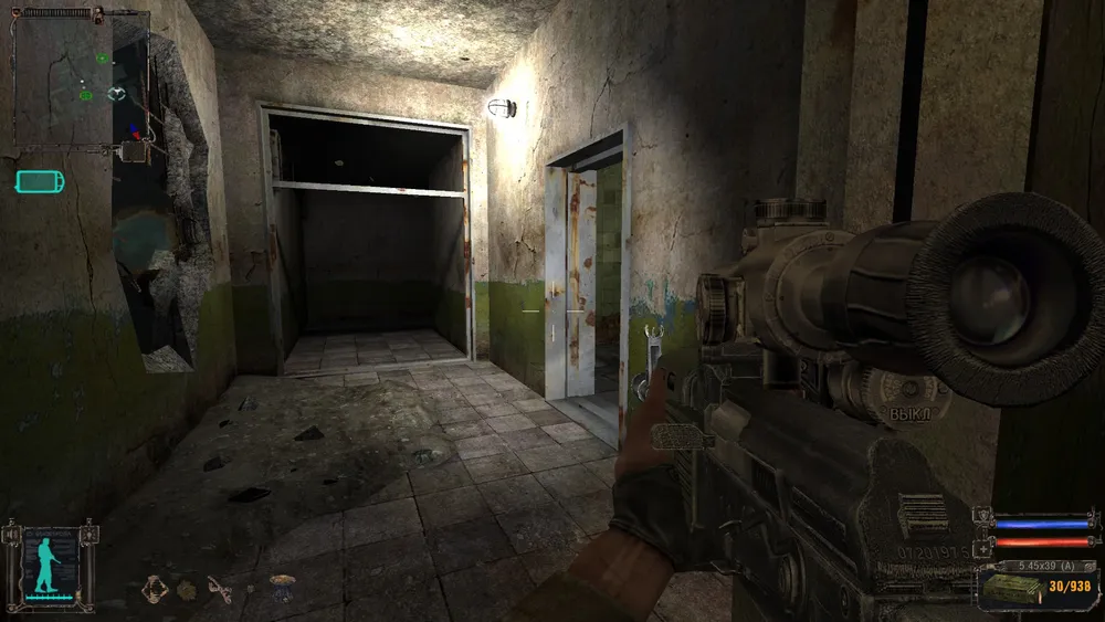 Первое место вы не пропустите, по центру (в дыре) бушует аномалия, нам же нужно повернуть направо, и открывать все шкафчики, где мы найдем броню, амуницию и АК со съемным подствольником, который лично я перекрепил вкупе с прицелом на модифицированный АК, найденный под НИИ - громоздко, несколько неудобно, но полезно.
