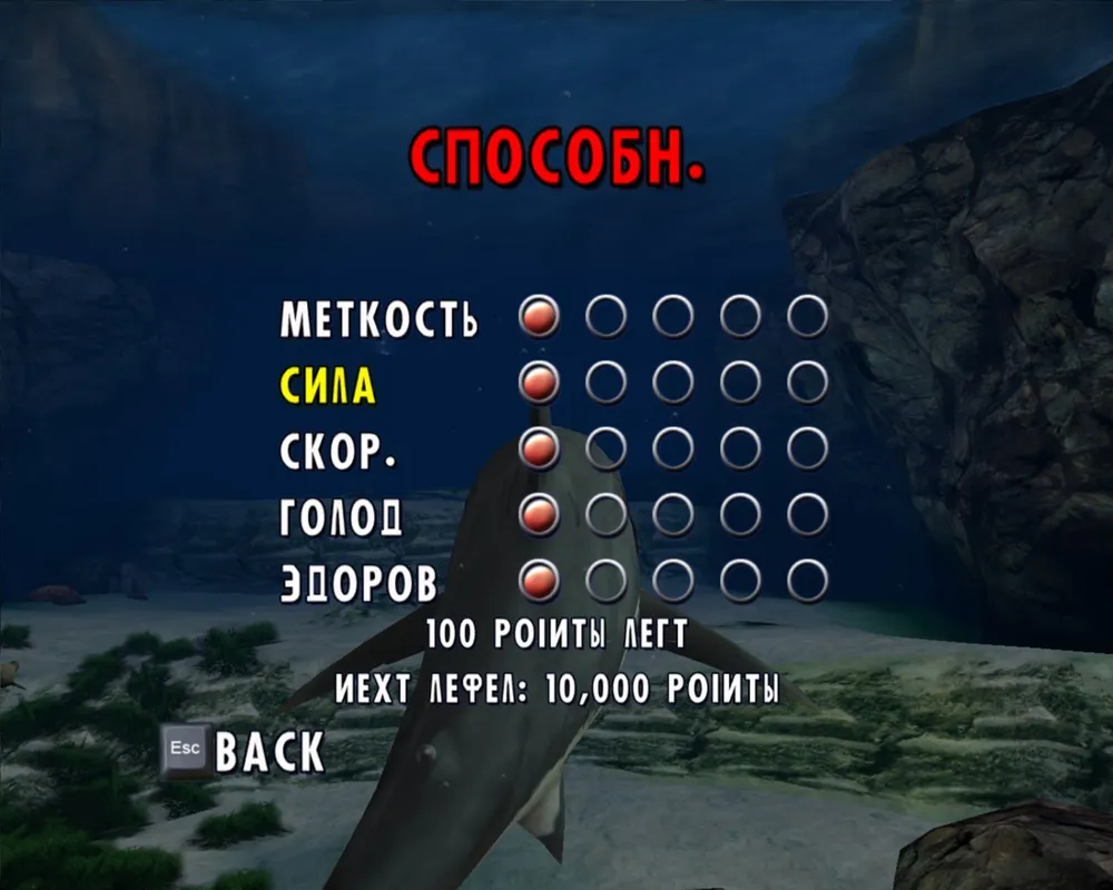 Прокачка акулы идёт следующим образом: допустим за 10000 очков мы прокачаем силу на 1 больше, в следующий раз прокачка силы на 1 она будет стоить 20000 очков, потом 30000 очков и т.д.