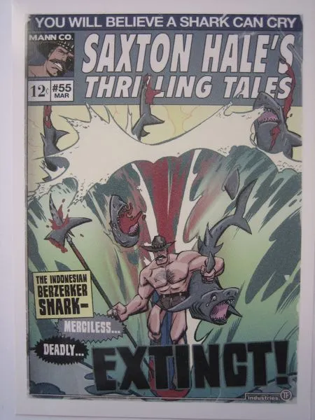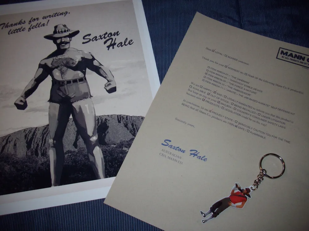 Так же любимцам Фортуны очень повезло во время обновления Снайпера против Шпиона (День 4) они получили письмо с логотипом Mann Co. в котором опять сообщалось о том, что товара на складе уже не осталось, а так же в конверте находилось несколько открыток, которые изображают обложки Рассказов о Сакстоне Хэйле (которые вы можете посмотреть выше).