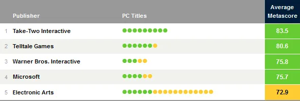 А вот рейтинг попроще: здесь издатели расставлены просто по средней оценке их игр 2012 года на Metacritic. (В скобках — общее количество релизов у издателя за 2012 год.)