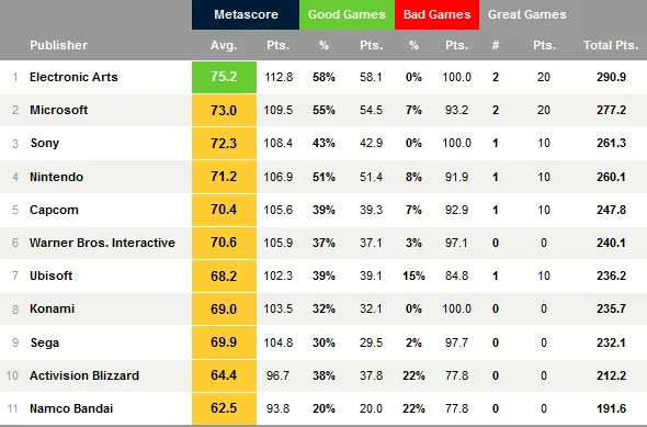 Авторитетный сайт Metacritic, аггрегирующий рецензии и выводящий средние оценки игр (и не только игр), выставил оценки за 2012 год крупным игровым издателям. Как это принято в наше время, люди с Metacritic составили рейтинг не по наиболее явной характеристике (средней оценке), а применили хитрую схему с начислением очков за среднюю оценку игр и за релизы низкого, хорошего и отменного качества. Картина, впрочем, сильно не исказилась: первые четыре позиции издательского рейтинга совпадают, как ни считай — по среднему баллу или по методике сайта. По мнению критиков, которых Metacritic видит в упор, издателем с самыми качественными играми в 2012 году стала Electronic Arts (прости нас за все кое-что, EA). За EA расположились три консольных платформодержателя (Microsoft, Sony и Nintendo). Вот сводная таблица от Metacritic.