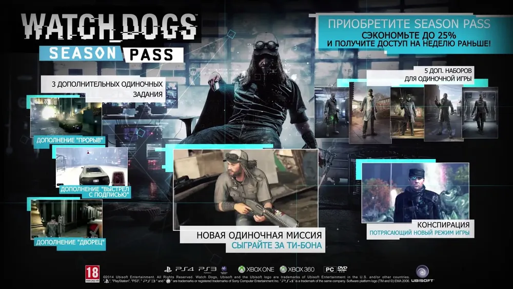 Оформившим Season Pass: доступ к дополнительной кампании, в которой вы сыграете за легендарного хакера Ти-Бона.Вы также сможете остановить нашествие киборгов, пытающихся захватить Чикаго. Ваша задача – выследить и нейтрализовать!