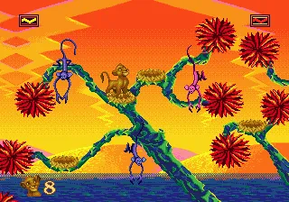 - На втором уровне Вы сможете пугать розовых обезьян своим рычанием. Напуганная обезьяна перевернется на ветке. Если Вы правильно расположите обезьян, а потом прыгнете на носорога, то он подкинет Вас вверх, а обезьяны поймают и перекинут через воду или жирафа.
