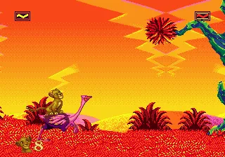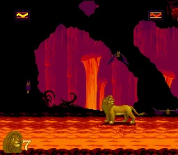 - В конце девятого уровня Вам предстоит убить брата отца Симбы, его зовут Шрам. Бейте его, пока он не станет лизать лапу. Тогда подойдите к нему и начните кидать его через себя. Бросок выполняется нажатием кнопок ВПЕРЕД + Y. Вам надо кидать его так, чтобы противник упал к краю обрыва, но между ним и краем