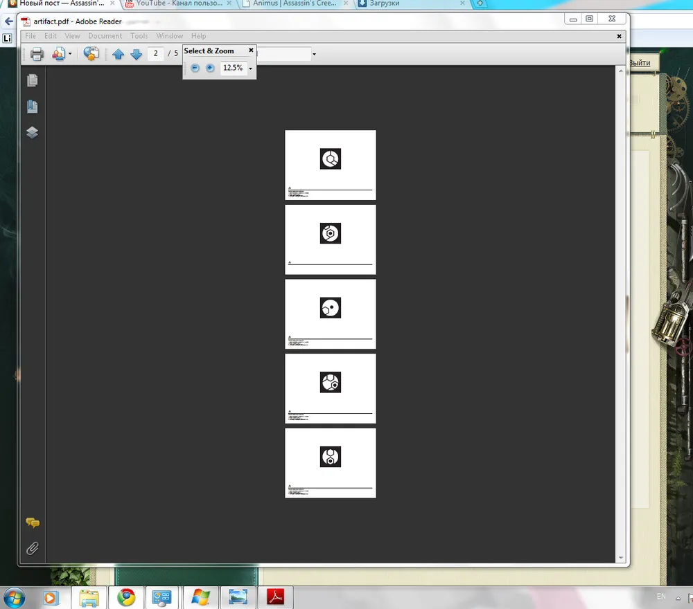 То есть вам предложат пересмотреть ролики. Это нам уже не интересно.) Мы должны клацнуть на круглый значок анимуса в центре экрана. Вам предложат сохранить файл artifact.pdf . В нем вы найдете 5 различных вариаций артефакта.