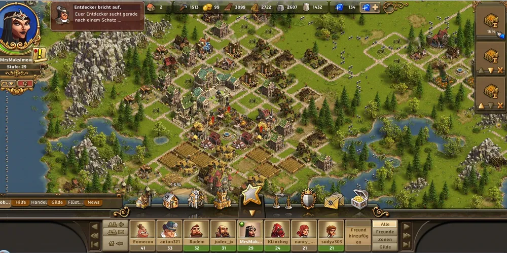 Но в данный момент, я предпочитаю немецкий, русифицированный сервер. Там, в принципе, полно русскоговорящих, поэтому, если вы что-то спросите в чате на русском языке – Вас услышат, поймут и что-то подскажут. Лично мне жалко расставаться с моим 29-ым уровнем, поэтому, пока и не ухожу на другие серверы…ведь, столько полей было пересажено, столько шахт перестроено…)))