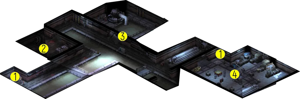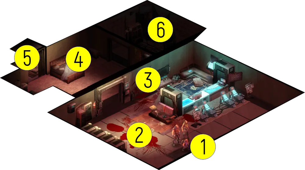 1 – выход на улицу. 2 – тело Туна. 3 – кровь на стене. 4 – стол. 5 – ванная комната. 6 – симсинтезатор.