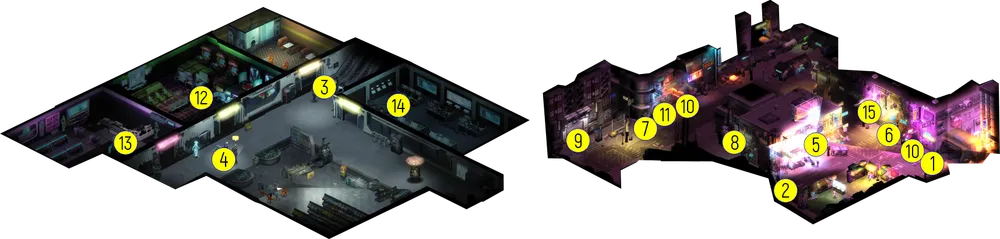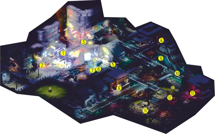1 – вход на станцию метро. 2 – клиника “Хромовая аллея”. 3 – Клуб 88. 4 – торговец-монах Паук Шень. 5 – Розарио Игнасио. 6 – растрескавшаяся изоляция. 7 – торговец Максимус Ло “Законник”. 8 – зал маджонга. 9 – надпись “Лазейка”. 10 – вход на корабль-убежище. 11 – торговец дронами Надежный Мэтью. 12 – Гин. 13 – Дом Пяти элементов.