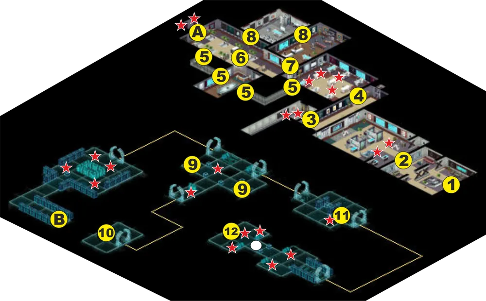 1 – вход. 2 – вестибюль. 3 – закрытая дверь. 4 – вход в бухгалтерию. 5 – вентиляционная шахта. 6 – пост охраны. 7 – офис. 8 – лаборатория. 9 – узел управления турелью. 10 – юридическая база данных. 11 – патентная база данных. 12 – узел управления лифтом. А – лифт. В – выход из матрицы. Звездами показаны враги.