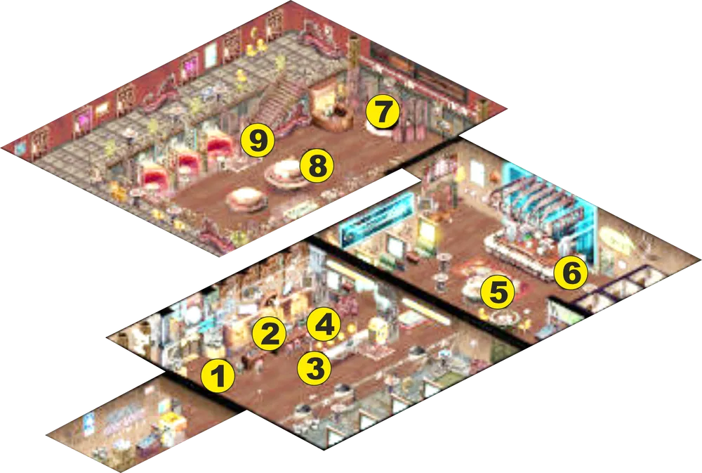 1 – коробка с чистыми пропусками. 2 – основной терминал. 3 – мусорная корзина А. 4 – мусорная корзина В. 5 – мусорная корзина С. 6 – стол. 7 – терминал Всеобщего братства. 8 – голографический проектор.