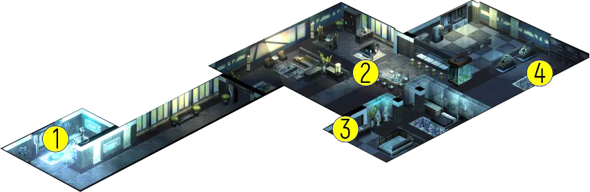 1 – выход из центрального лифта. 2 – выход из грузового лифта. 3 – добыча (амулет элементаля природы). 4 – комната отдыха. 5 – дверная консоль (код найти не удалось). 6 – цветочный магазин. 7 – сенсоримат. 8 – центральный выход.