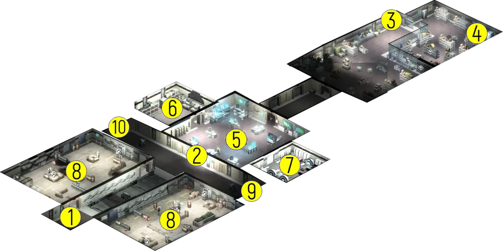 1 – лифт. 2 – закрытая дверь. 3 – панель управления. 4 – терминал. 5 – терминал командного цента. 6 – арсенал. 7 – медпункт. 8 – тренировочный зал. 9 – подъем на крышу. 10 – спуск в гараж.