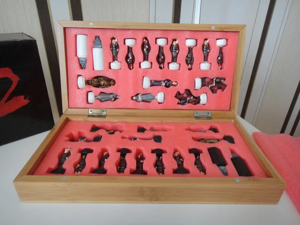 Внутри нее в поролоновой вкладке хранятся шахматные фигуры.