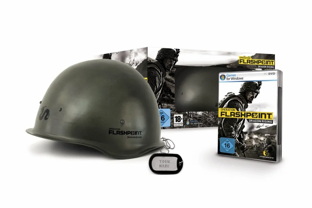 В сети появилось изображение German Limited Edition выходящей в октябре Operation Flashpoint 2: Dragon Rising. К диску, как ни странно, прилагаются, что бы подумали?.. Шлем и жетон. Сразу вспоминается ModernWarfare2 с его прибором ночного видения, правда?