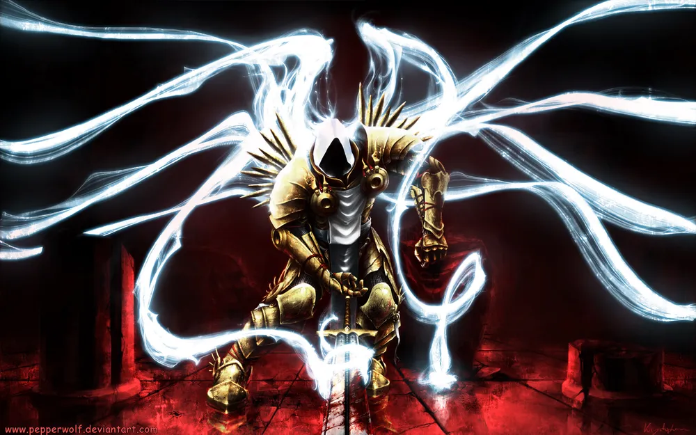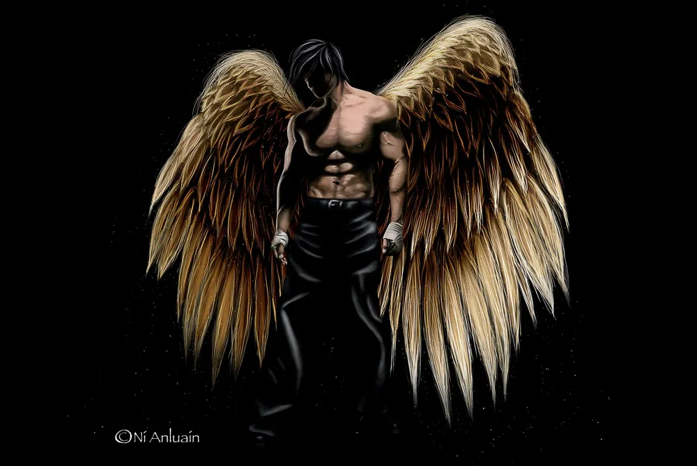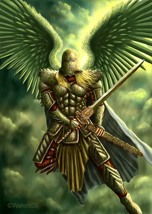 Сверху, словно солнце, появилось существо с чёрными крыльями и белоснежно-золотистыми доспехами, волосы его были длинными и чёрными словно уголь, в руках оно держало чёрный, гигантских размеров меч, и начало спускаться ко мне, обжигая небеса ярким пламенем и накаливая воздух до состояния сильной духоты. Через минуту оно очутилось прямо передо мной, гордо повиснув в воздухе, и казалось выше меня ростом и много могущественнее меня по физическим параметрам и психо-магнетизму.