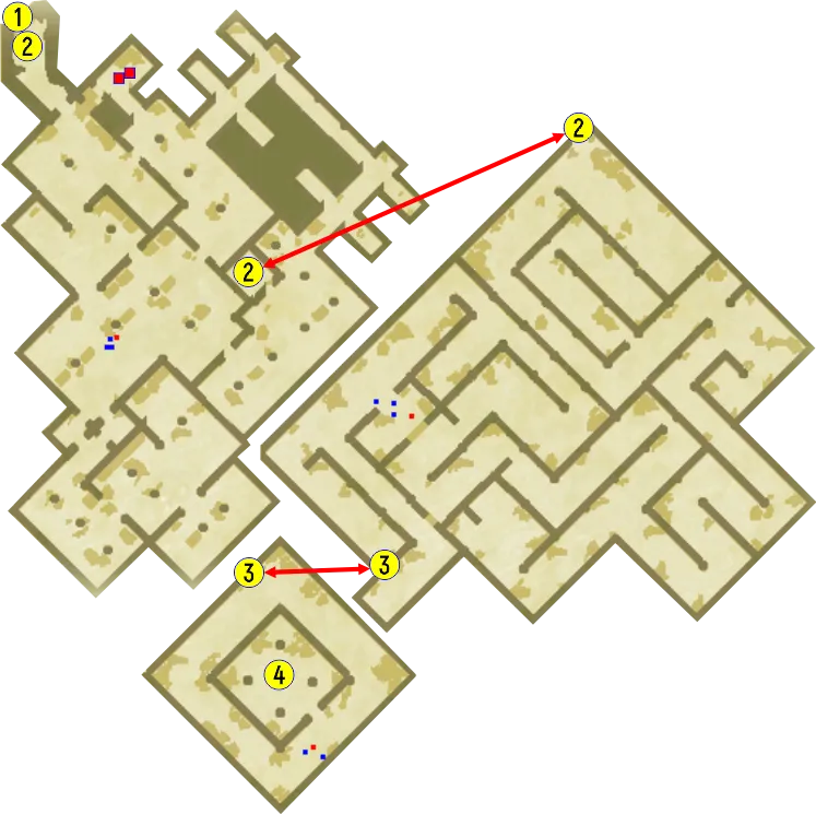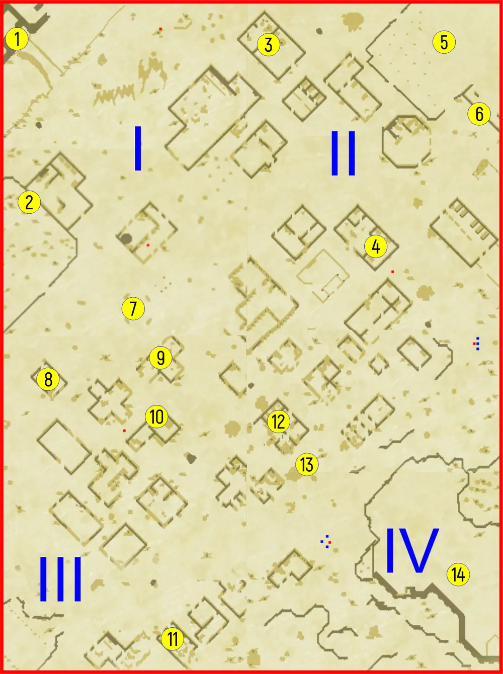 1 – лестница. 2 – некромант Фелиус. 3 – Кости. 4 – переход между пещерами и подвалом. 5 – Мустафа. 6 – западные ворота. 7 – гонец. 8 – место схватки. 9 – переход между пещерой 1 и пещерой 2. 10 – переход в храм. 11 – переход в усыпальницу. 12 – переход в деревню.