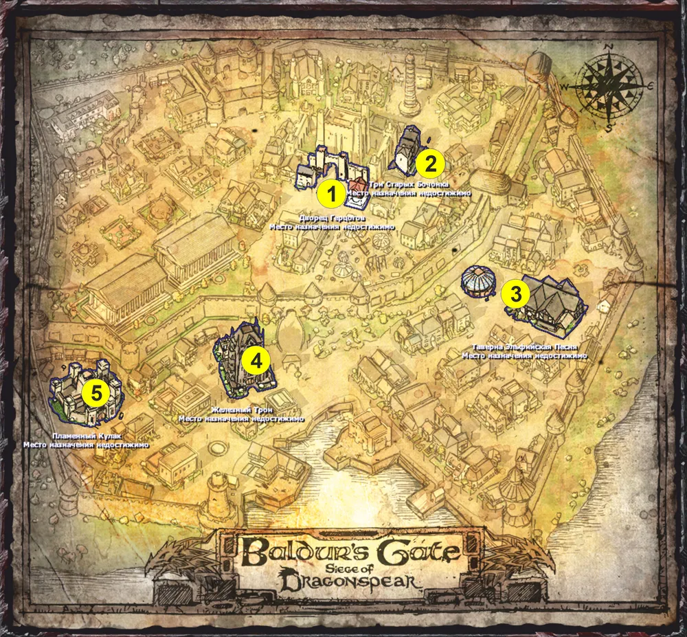 1 - дворец герцогов; 2 - постоялый двор «Три старых бочонка»; 3 - магазин и таверна «Эльфийская песня»; 4 - штаб-квартира «Железного трона» 5 - замок «Пламенного кулака»