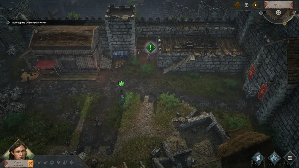 Днем мы играем в легкий экономический симулятор с нотками выживания: вот у нас есть пара крестьян, небольшой внутренний дворик в котором можно строить, огороженный каменными стенами бастиона, и свинюшки с курами. Крестьяне выполняют роль героев - у них есть свои сильные стороны (кто-то больше переносит грузов, кто-то быстрее строит), они могу возводить и ремонтировать постройки, кормить скот. При этом за своими героями нужен глаз да глаз, так как они нуждаются в пище, воде, крове, медицине и хорошем настроении - об этом сообщают соответствующие иконки! Сами они ничего не могут, даже попить водички, поэтому вам вручную придется утолять каждую потребность своего подчиненного, благо это не the Sims, и количество управляемых героев у меня не превышало четырех.