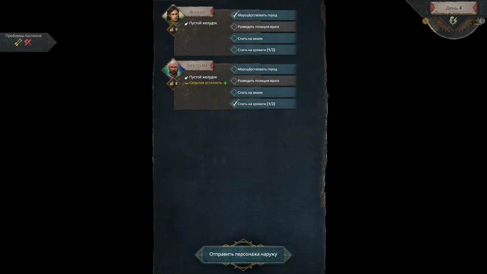 С наступлением темноты, мы можем отправить в город одного героя воровать припасы, а других - спать или в разведку. Разведка осуществляется автоматически и позволяет узнать время повторной осады, что малоценно, так как враги атакуют, примерно, с одинаковой периодичностью.