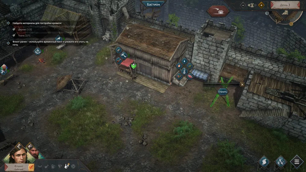 Строительство и создание предметов являются ключевыми функциями вашего бастиона. Однако казармы или литейный завод, как в варкрафте, возвести вы не сможете. Сооружать мы будем компактные мастерские, небольшие лесопилки, костры для жарки и так далее. Все это служит для создания или переработки ресурсов: какие-то идут на пропитание, какие-то на строительство, какие-то на помощь армии. Хоть в сражениях мы сами не участвуем, но невидимая рука армии существует и будет регулярно просить у вас помощи. Защитникам почти всегда нужны бинты для перевязки, а еще луки, ремонт экипировки и еда - и вам придется их этим снабжать, иначе вас завоюют.