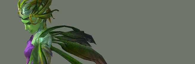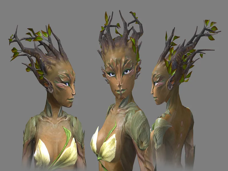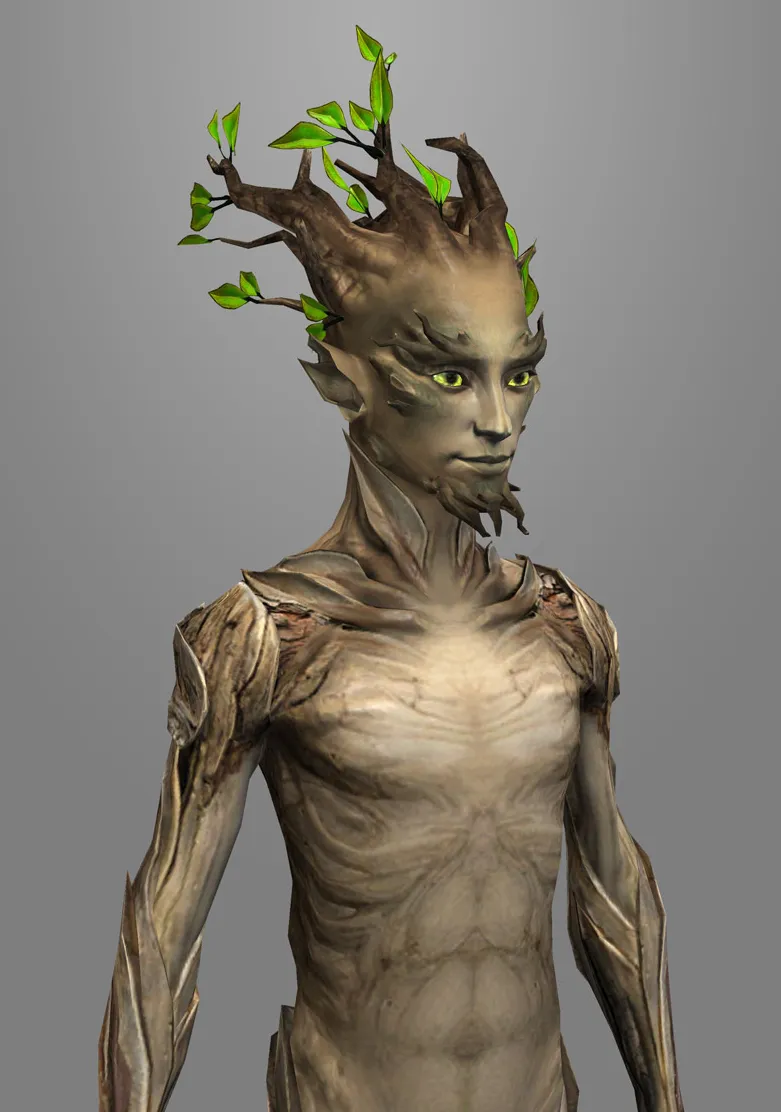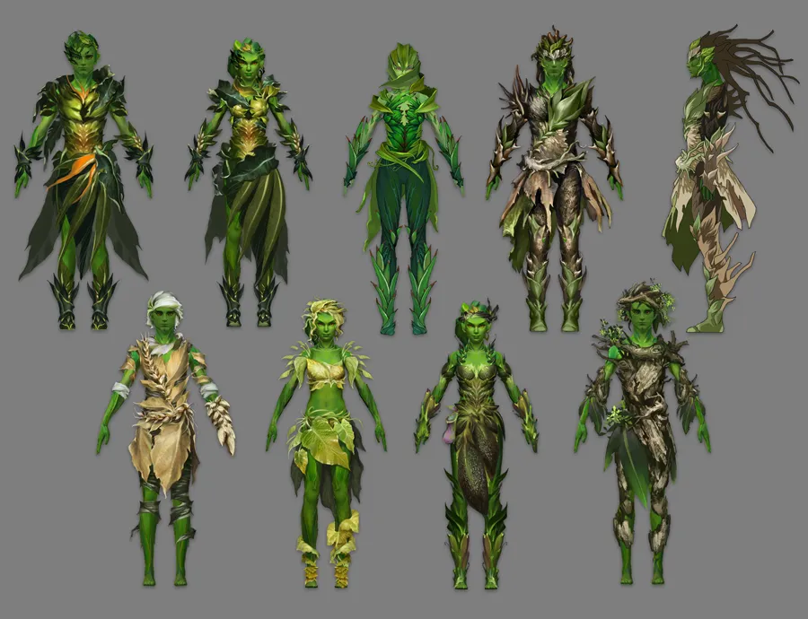 Следующим шагом для Кристена стало открытие образа дриады, в котором сочеталась листва огромного количества расцветок, либо кора, выступавшие, как текстура кожи и детали, раскрывающие простор для творчества в образе растениеподобной расы. Для Кристена такой дизайн выглядел похожим на грим для сцены и, на самом деле, не дал нужного толчка для развития нового образа расы.