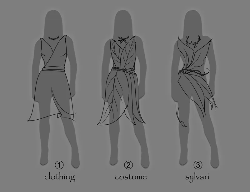 Раз тело сильвари так сильно завязано на анатомии растений, Кристен не видел причины, почему с одеждой должно быть по-другому. Небольшая трудность возникла при попытке объяснить должным образом простым людям разницу в нарядах растений, потому что, похоже, что некоторые нежелательные ассоциации в сознании людей прочно укоренились. В чем суть…рисунок внизу демонстрирует простое легкое платье, скрепленное поясом и дополненное ожерельем. Если вы попросите случайного прохожего рассказать, как выглядит наряд из растения, они, возможно, поменяют ожерелье-цепочку на лозу и расширят присутствие в платье разного рода листьев по виду и форме. Однако, это лишь поверхностный вид платья и таким образом больше выходит цирк, а не костюм .