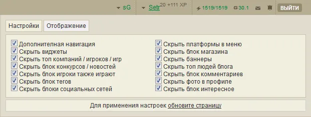 - Дает возможность настройки отображения основных блоков и элементов сайта