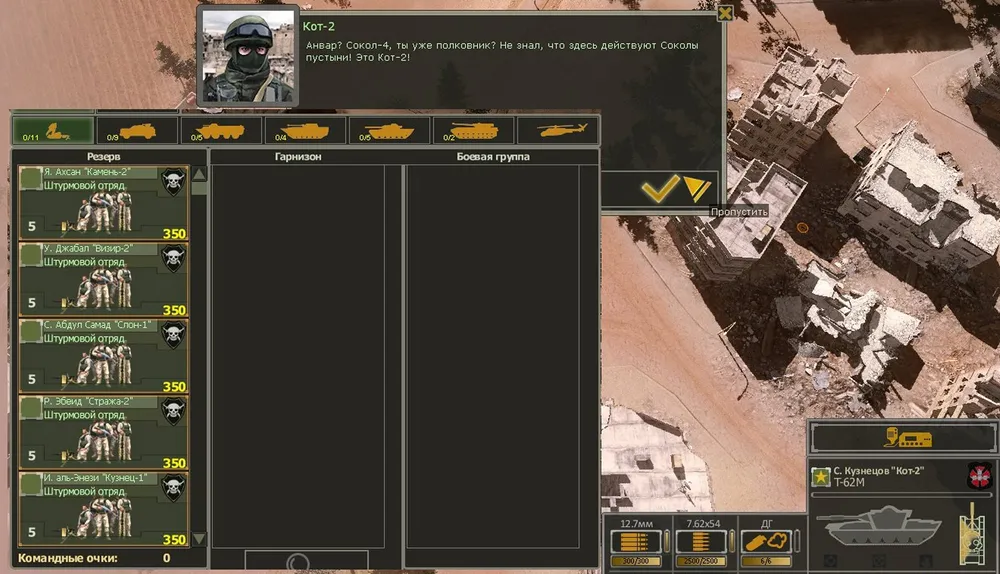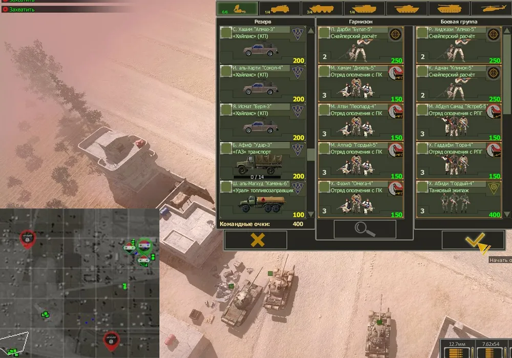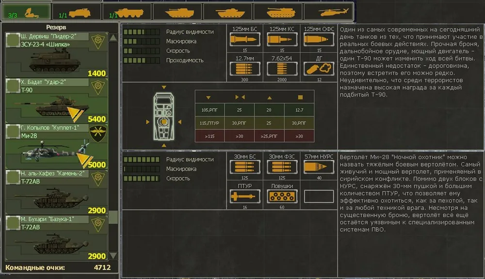 На первый взгляд: ух ты, сколько и каких войск дают для начала миссии! Но стоит немного разобраться, как радость проходит. Дело в том, что кроме того, что находится в резерве, вам больше ничего не дадут. Отрядов пехоты нет, есть штурмовые отряды — с бесполезными АГС на вооружении. Правда, в наличии четыре отряда «Тигров» - первого уровня. Три Т-72 (на «Реалистичном» только два) и всего четыре машины снабжения тяжёлой техники.