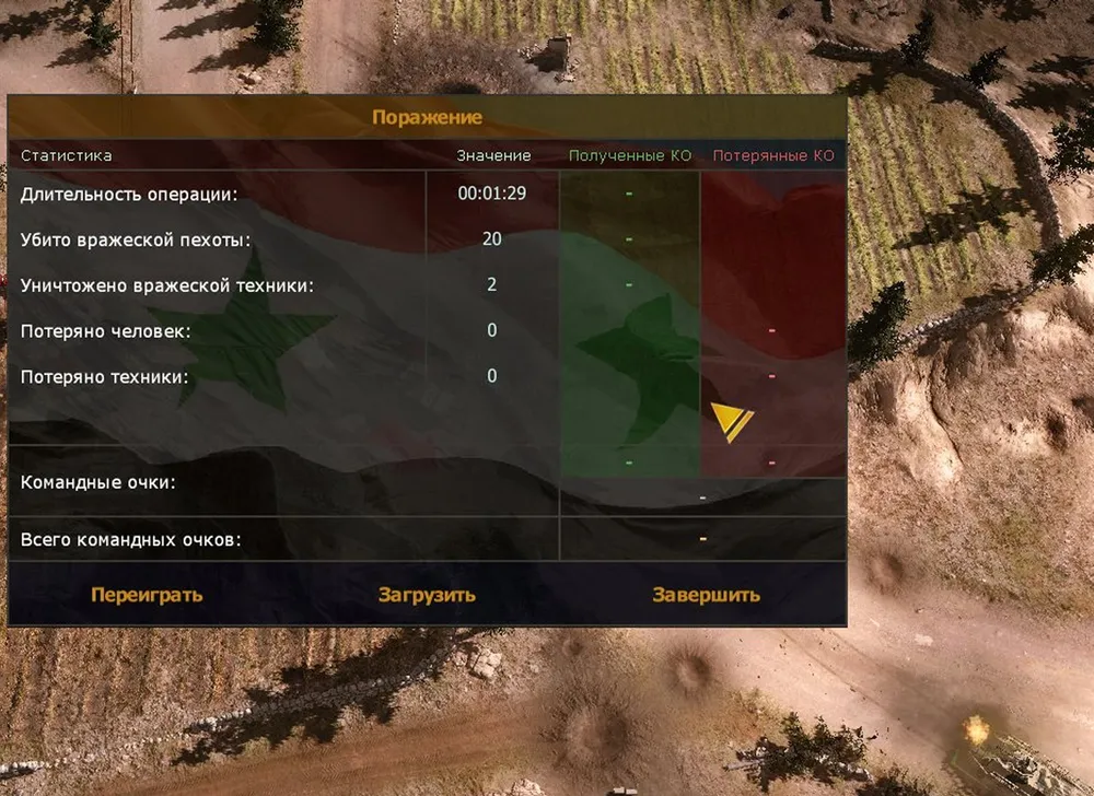 После захвата первой точки предложат подкрепление: суммы очков не достаточно для приобретения техники, а из пехоты остались в основном бесполезные отряды ополчения. Впрочем, всё это уже не имеет значения - победа.