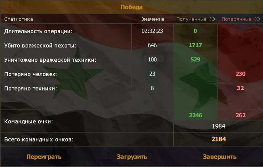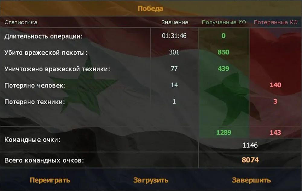 Почти всё, остаётся дождаться приказа эвакуации «Тигров» из штаба. Все сирийские войска переходят под ваш контроль, в том числе и «Шилка». (Увы, её не удаётся захватить, даже заменив экипаж: в точке эвакуации экипаж исчезает из неё неизвестно куда, заменить его ещё раз не удаётся. Жаль.)