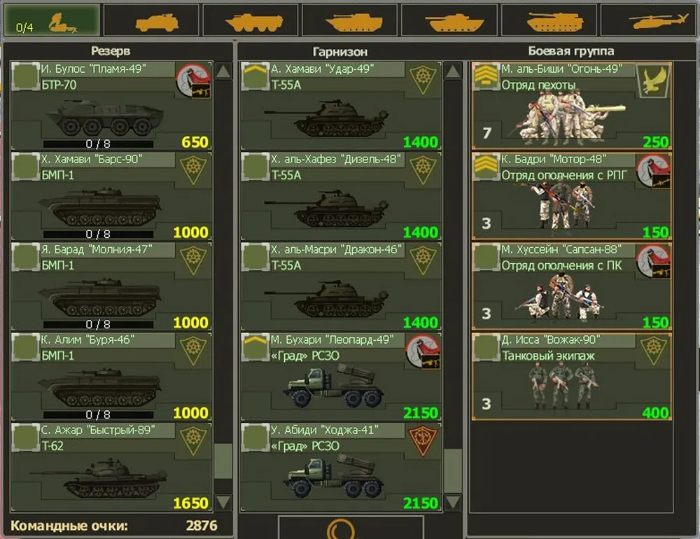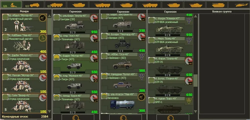 Атака отбита и контрольная точка захвачена? Получаем подкрепление: обязательно БМП-2 с ПТУР, танковый экипаж для «Шилки» (лучше – два), машину снабжения тяжёлой техники и бензовоз (ещё один, как и тяжёлая машина снабжения, есть на карте – можно захватить). Теперь нужно найти РСЗО – но торопиться с этим не стоит.