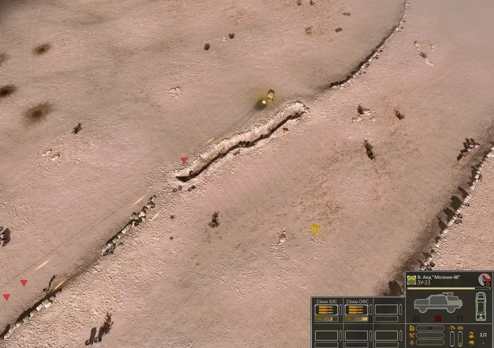 Занята точка в левом верхнем углу карты, и начинают поступать периодические подкрепления. Первый же конвой включал в себя «Урал» снабжения: ура, у танков заканчиваются боеприпасы! Но тут на позицию с незащищённой пехотой пришла «Шилка»: как раз, когда сапёры минировали подступы… Пришлось загрузить игру, а в следующий раз я получил одну -единственную БМП. (При повторном прохождении первой миссии я очень нуждался в БМП, а меня заваливали караванами снабжения – три подряд! «Баланс», да?)