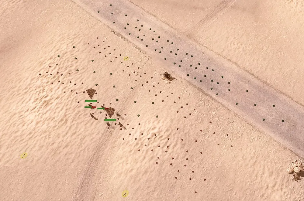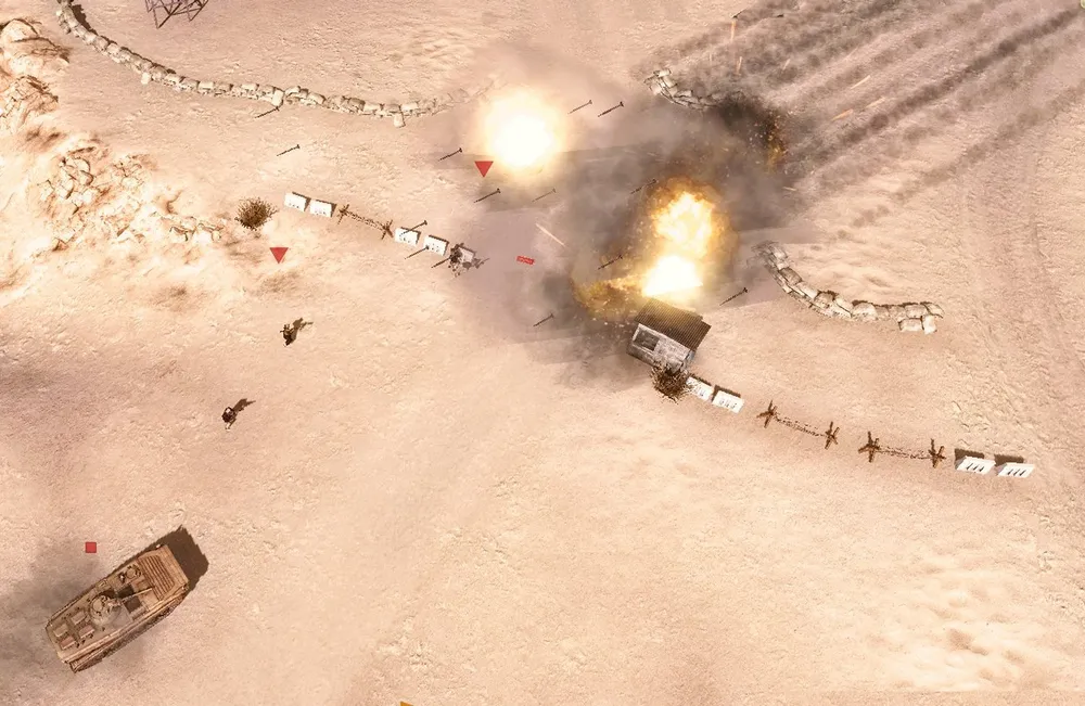 Пара отрядов (одним из них должен быть отряд со станковым гранатомётом) отправляется к южной контрольной точке, захватывает её, оставляя гранатомётчиков на охране, и отводит машину снабжения к окопам. (Почему оставляем отряд со станковым гранатомётом? Медленно перемещаются, медленно набирают опыт и не могут открыть огонь мгновенно: неэффективны.)