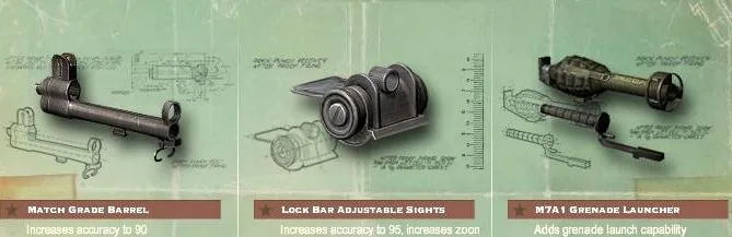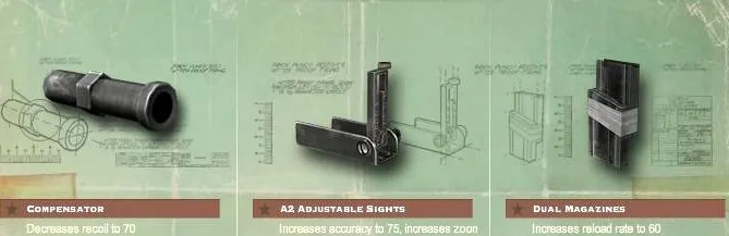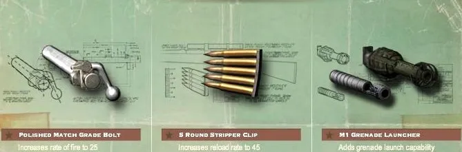 Доброго времени суток! Мне очень понравилась система модернизации оружия Medal of Honor: Airborne. Конечно, модернизация прямо на поле боя выглядит нереалистично, но всё-таки… Появилось желание узнать, как развиваются все виды стволов. К сожалению такой информации на русском языке не нашлось, но я не поленился и перевёл, то что нашёл и приправил текст картинками. Для начала ограничимся ступенями модернизации американского оружия. Начну с общей информации. Насколько я понял, прокачка оружия осуществляется за счёт некоторого количества (вот бы знать какого?) убийств с одного выстрела или одной очереди.