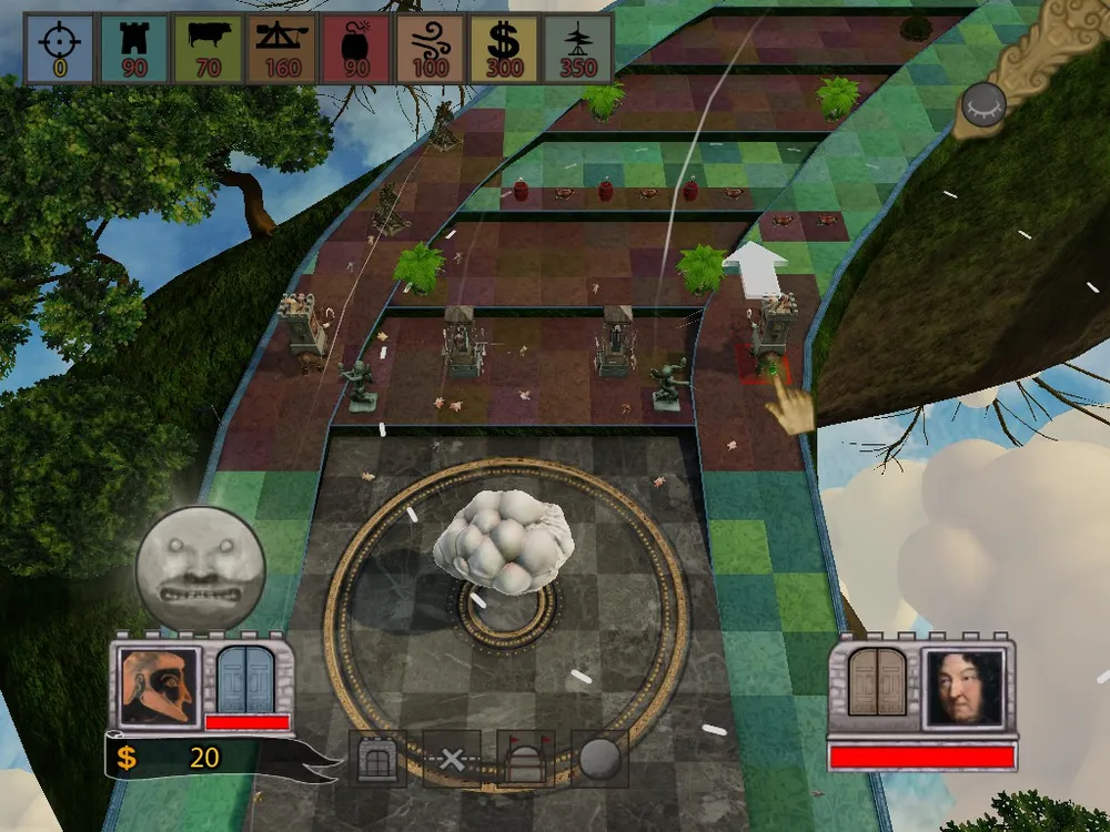 Ваш противник не сидит на месте, им тоже манипулирует “жажда крови”. В начале раунда и после каждой атаки ворот, дается время на защиту себя любимого (пока мастера-каменотесы создают ваш кумушек). В игре представлены различные сооружения (сторожевые башни, катапульты, вентиляторы, бочки с тротилом), а так же представители фауны (быки, мамонты). Располагать их можно только в определенных местах, и каждый юнит стоит денег (в начале дается небольшая сумма, а как заработать больше сказано выше). Все эти заграждения замедляют врага, разрушить шар не такое простое дело. Но для нас важнее всего быть первым! Враг в свою очередь тоже расставляет коварные ловушки на нашем пути. Можно идти на таран, а можно аккуратно их обходить, демонстрируя ловкость рук и быстроту реакции. Если вы упали в пропасть, ничего страшного, неведомая рука вернет вас обратно.