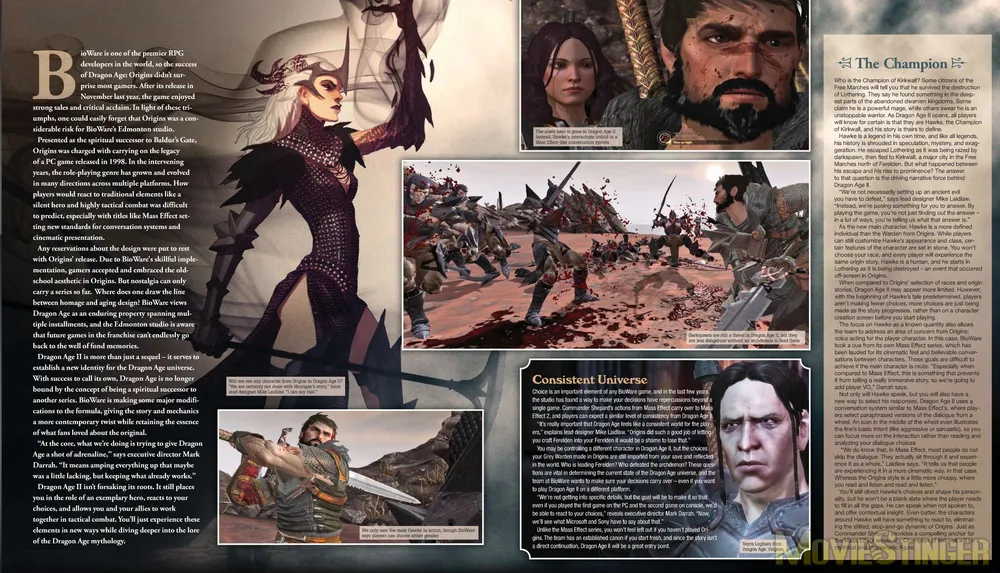 Вы будете делать выбор за Хоука (Hawke) и формировать его личность, но он не будет пустым шаблоном, который должны будут заполнить игроки. Он может заговорить сам по себе, а также высказывать догадки [или подсказки, не понятно] в зависимости от контекста. Более того, персонажам вокруг Хоука тоже будет на него реагировать, избавляя нас от натянутой и прерывистой динамики Origins. Командор Шепард является мощной точкой отсчета в серии Mass Effect. По аналогии и Чемпион Киркволла будет мифической и харизматичной фигурой.