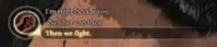 На одном из скриншотов видно новую систему диалогов. На выбор есть три коротких реплики, причем соответствующая характеру ответа иконка изображается в центре круга. Скриншот неразборчив, но можно догадаться, что выбран вариант "Then we fight", иконка в виде кулака. Очевидно, этот вариант диалога приведет к битве.