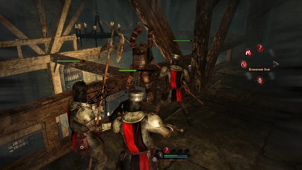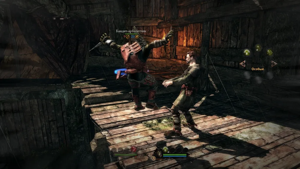 Существенный недостаток (хотя в определенных эпизодах и преимущество) имеется и у самого Аркаила, а именно – неконтролируемый, всепоглощающий и разрушительный гнев. Как и в Game of Thrones, в Of Orcs and Men можно найти несколько вариантов стоек, каждая из которых предусматривает ту или иную манеру ведения боя. Наиболее мощные удары Аркаил наносит именно в атакующей стойке, но это палка о двух концах. Чем жестче дерется орк, чем больше он применяет навыков, тем быстрее у него заполняется шкала ярости. Как только ярость достигает критической отметки, Аркаил превращается в сумасшедшего берсерка с перекореженной красной рожей. В таком состоянии он и бьет больнее, и удары наносит быстрее, и позвоночник зазевавшегося противника может о колено переломить, но вот в чем беда – его совершенно невозможно контролировать. Орк кромсает все в радиусе видимости, раздает мощные оплеухи и пинки направо и налево, причем под горячую руку часто попадает и бедняга Стикс. После припадка бешенства Аркаил еще десять секунд шатается от усталости, чем и пользуются раскиданные по углам недобитки. В такие моменты нужно переключаться на Стикса и оказывать собрату-дуболому посильную помощь, не приближаясь при этом к орку ближе, чем на несколько метров – зашибет.