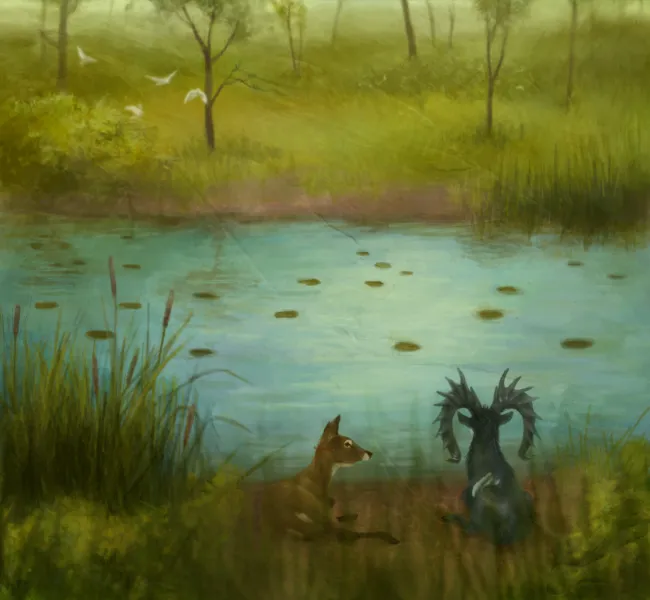 Улыбнувшись, он добавил (по секрету), что если 5 оленей соберутся вместе и будут достаточно долго стоять, то они научатся даже превращаться в других животных. "Впрочем, - сказал он - в лягушку ты умеешь превращаться уже сейчас!", и шутливо столкнул меня в озеро. Когда я снова приняла форму олененка и выбралась из озера, его уже не было.