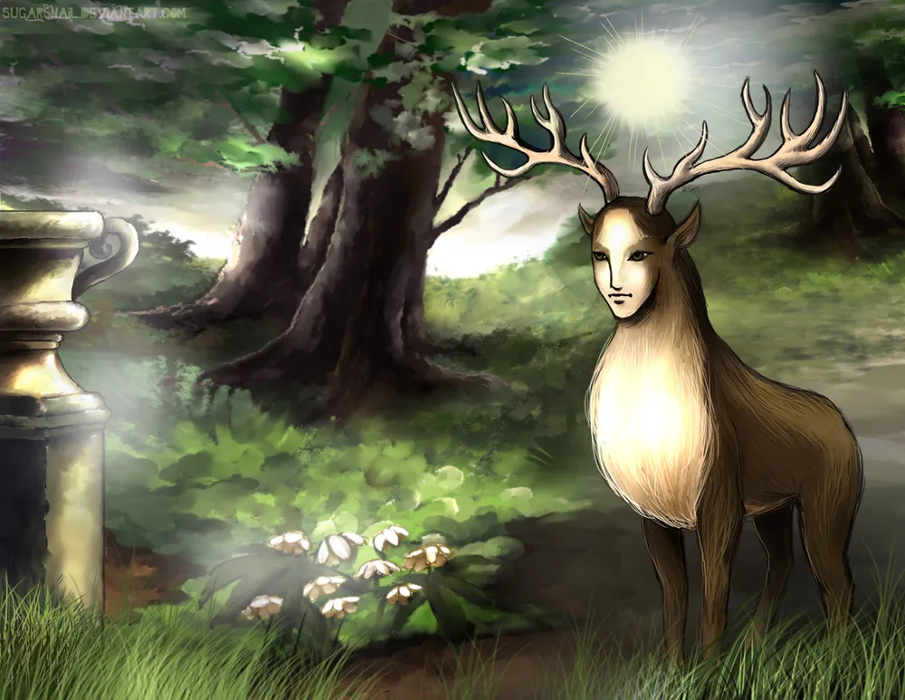 А у воды стоял он. Еще один Олень. Теперь я знала точно, кто мы. Он был выше и больше меня, шерсть его была темно-коричневого цвета, а над головой вздымались красивые рога, между которыми светился знак. И лицо… У него не было морды, больших глаз и ноздрей, ну то есть всего того, что можно увидеть у обычного оленя. У него было человеческое лицо, и он смотрел на меня. Нет, как и Лес - в меня. Потом я привыкла к этому, и тоже научилась видеть сущность других Оленей. Ведь все мы здесь делим одну душу на всех.