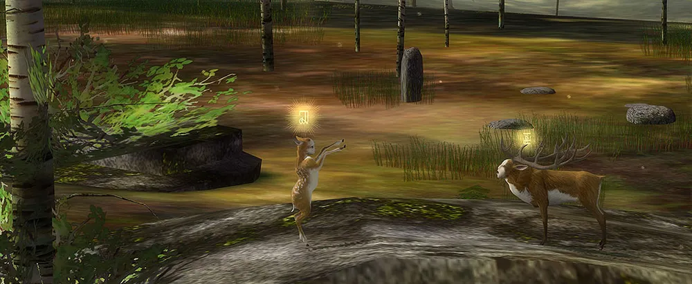 Озеро, как я узнала позже - это основное место для встреч Оленей. На одной стороне озера есть деревья, с которых падают вкусные, любимые Оленями шишки, а рядом растут древесные грибы. Тут же стоят два камня, символизирующие Богов-Близнецов. На другой стороне озера спокойно и тихо, там можно поспать и отдохнуть после игр в Лесу.