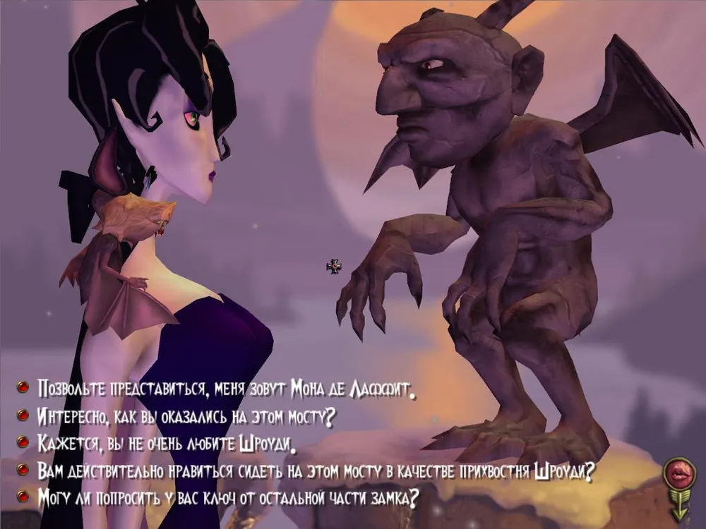 При выборе объекта появляется контекстное меню с возможными действиями: поговорить, посмотреть, взаимодействовать (подобрать предмет или что-то с ним сделать), полететь в образе летучей мыши. Подобное меню было, например, в Full Throttle. Мона двигается неспешно, но при помощи пробела можно пропустить анимацию ходьбы и телепортировать её прямо в указанную курсором мыши точку. Переход между локациями оформлен по нажатию стрелочки, появляющейся у границы экрана, процесс смены локаций можно ускорить, если нажимать правую кнопку мыши. Правда правая кнопка мыши также открывает окно инвентаря, поэтому иногда случаются мелкие неприятные казусы, если курсор мыши оказывается не в том месте и нажатие ПКМ приводит не к тому результату, что хотелось бы.