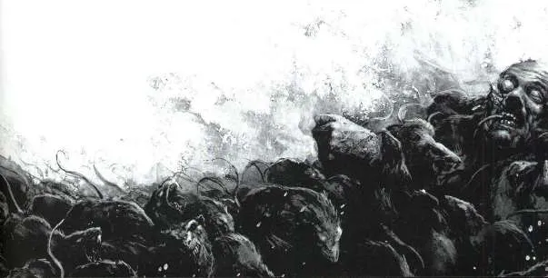 Люди стояли спиной к спине и сражались за свои жизни, но против безжалостной свирепости и бесчисленного множества орды грызунов их оружие было бесполезно. Волна чудовищных крыс поглотила их одного за другим. Их утаскивали и разрывали на части, желтые резцы впивались в податливую плоть, темная масса заглушала их жалкие крики леденящим душу хрумканьем.