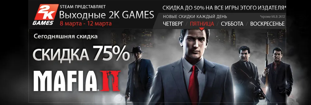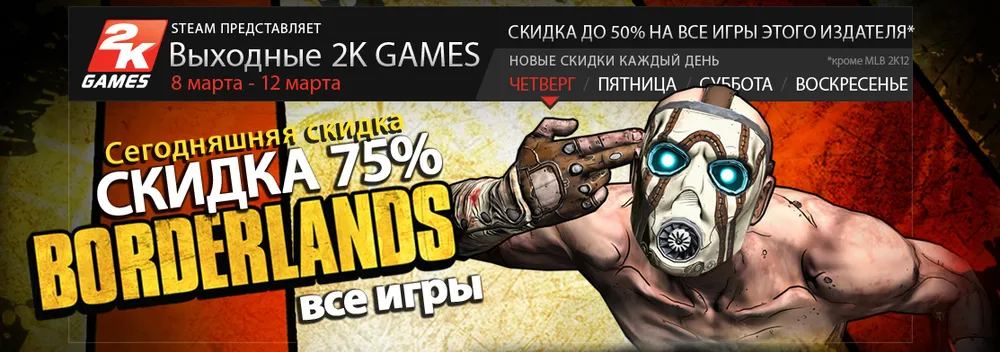 В steam новые скидки! На этот раз скидка 50% на все игры от 2K Games! Акция действует с 8 по 12 марта. К примеру, можно купить пак игр X-Com за 124 рубля, Bioshock за 124 рубля. Также, каждый день будет скидка 75% на 1 игру от этой компании. С нетерпением ждём новых и ещё более щедрых скидок!