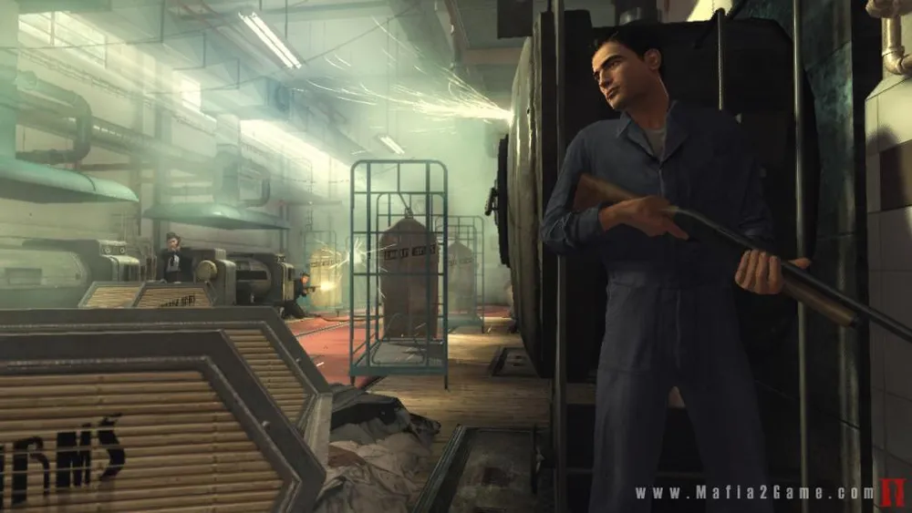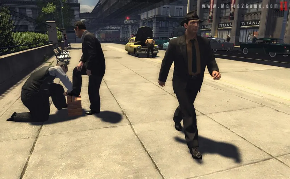 Интересную деталь новой Mafia II можно заметить на первом скриншоте, который, вместе с двумя другими, был любезно представлен общественности студией 2K Czech. Игровая атмосфера напомнит нам о городах 40-ых годов, в которых их виртуальные обитатели живут своей полноценной жизнью: они начищают до блеска ботинки прохожих, продают газеты, а порой попадают под колеса автомобиля очередного гангстера.