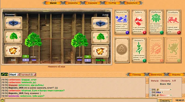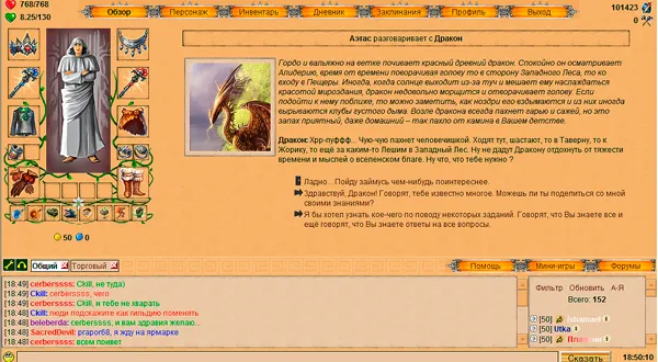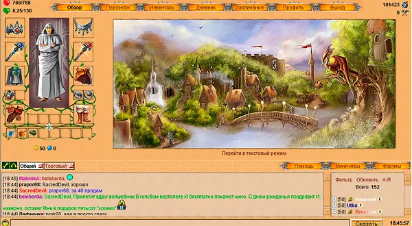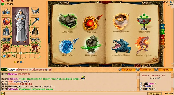 Я тогда поясню скриншоты тут) 1 скриншот: На этой картинке изображена книга магии, как можно судить из неё, в игре присутствуют 3 стихии магии, огонь, вода и земля. Есть так же и 4 стихия, нейтральная, она используется вне боя. 2 скриншот: На нем представлен город, во всем своем великолепии. В нем все просто и понятно. присутствует удобное выделения и пояснение к сданием, достаточно просто навести на них мышкой. 3 скриншот: Им представлен разговор с НПС Драконом, можно выбрать любой вариант ответа, от него будет зависить дальнейший путь квестов. 4 скриншот: Изображена мини-игра. Она называется Магия. Смысл игры прост, построить своё дерево до 50 или разрушить дерево противника. Самая популярная мини-игра в Алидерии. Существуют так же и другие мини-игры. Чтобы посмотреть их, достаточно тыкнуть по кнопке "мини-игры" в правом нижнем углу экрана.